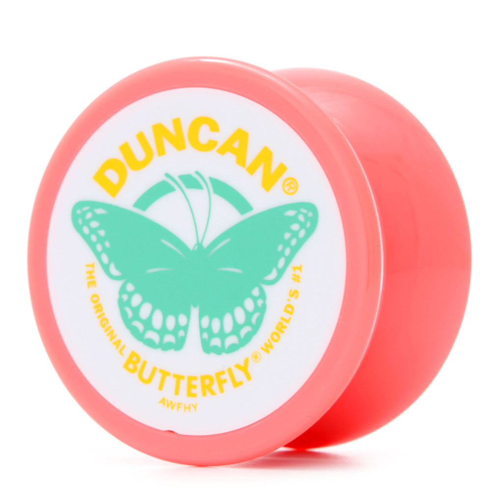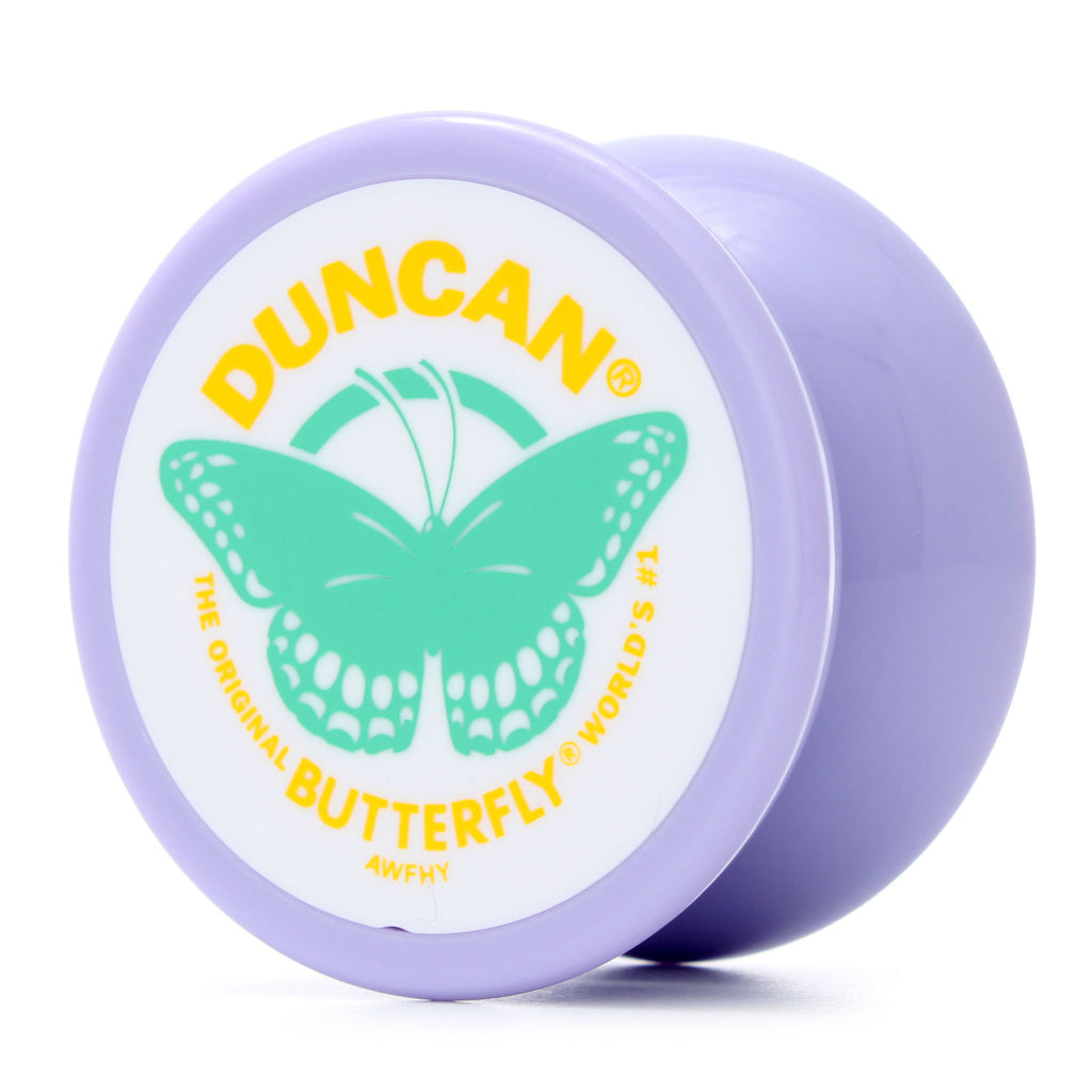 The butterfly has a history as long as the Imperial. With the out-wardly curving shape, similar to that of a butterfly extending its wings, this shape has also been known as hand drum shape or V-shape, but the term "butterfly" has taken root for 1A yo-yos, and now everyone knows what you mean when you use it. The shape takes a lot of design inspiration from the Imperial, but with a wider trapeze width to make string tricks easier. Just like the old days, it has a fixed axle, making sleeps incredibly short, but good enough for a simple trick or two. A challenge for beginners and old schoolers alike.