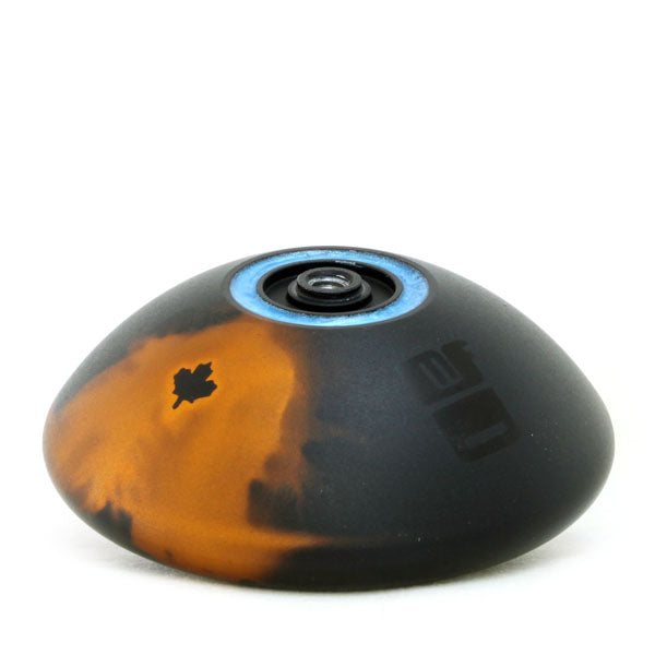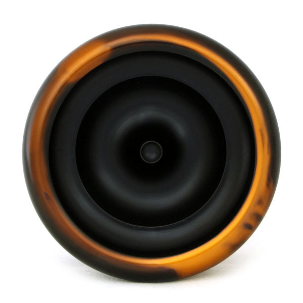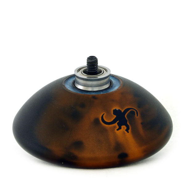 A standard shape with a low edge, the Gelada is a full size yo-yo with a decent weight balance and an attractive color treatment. The Gelada's true value shines through its amazing combination of powerful spin and ease of use. The areas that will come in contact with the string are given a blast finish, giving the Gelada a combination of smooth subtlety and gleaming beauty. As an added design bonus, the rounded body has a maple leaf or monkey silhouette in the coloring or an MFD (MonkeyFingerDesign), decided at random.