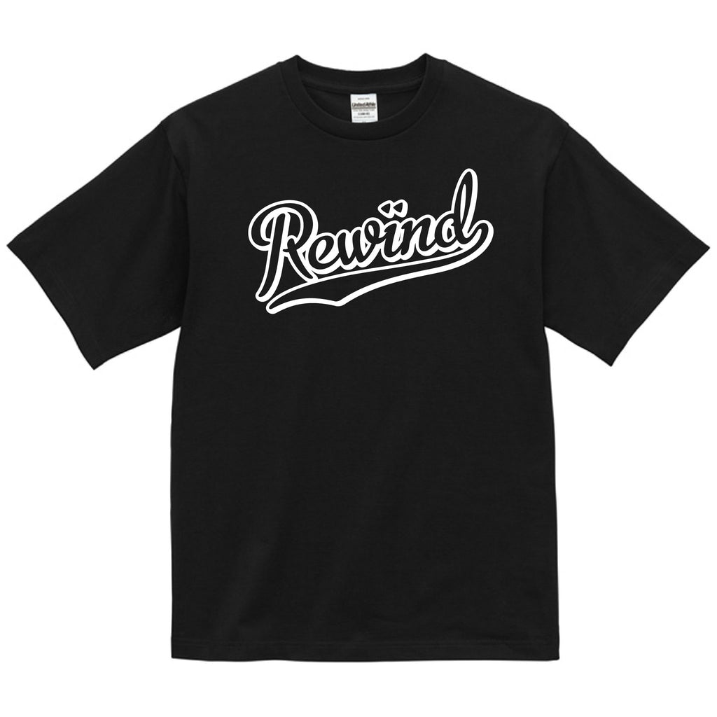A T-shirt featuring a baseball-style REWIND logo print.